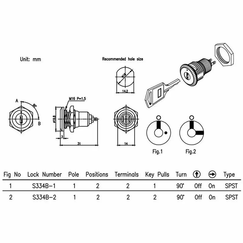 16mm電源鎖S334B-1鑰匙僅在12點可抽出,S334B-2鑰匙在12點與3點都能被拔出,接點與端子腳鍍銀,2支端子腳,電訊OFF-ON,迴路型態SPST(單刀單擲),用六角螺母或插片安裝固定,可依客戶需求增加加工工序,如:焊線、打號、車修.....等等。