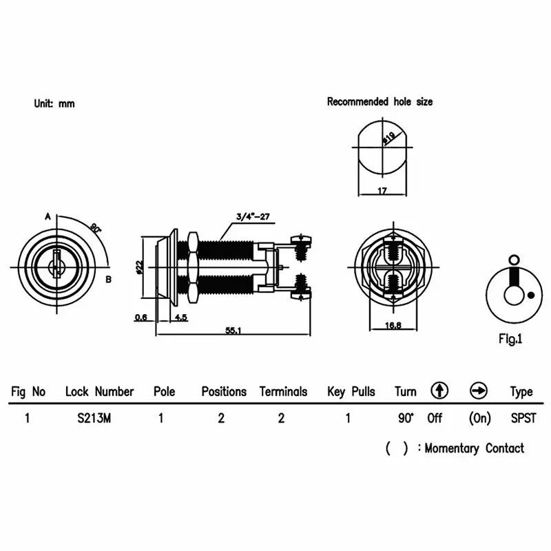 19mm UL認證電源鎖為二段式設計,S213鑰匙轉向12-3點,電訊OFF-ON,迴路型態SPST(單刀單擲),鑰匙為單抽僅可於12點位置抽出;S213M鑰匙轉向12-(3)電訊OFF-(ON),內裝彈簧瞬間接觸導通電流鑰匙在3點瞬間接觸後歸位,僅12點位置抽出。可依客戶需求增加加工工序,如:焊線、雷雕、打號.....等等,在便於生產的數量基礎下亦可依客戶需求客制規格。