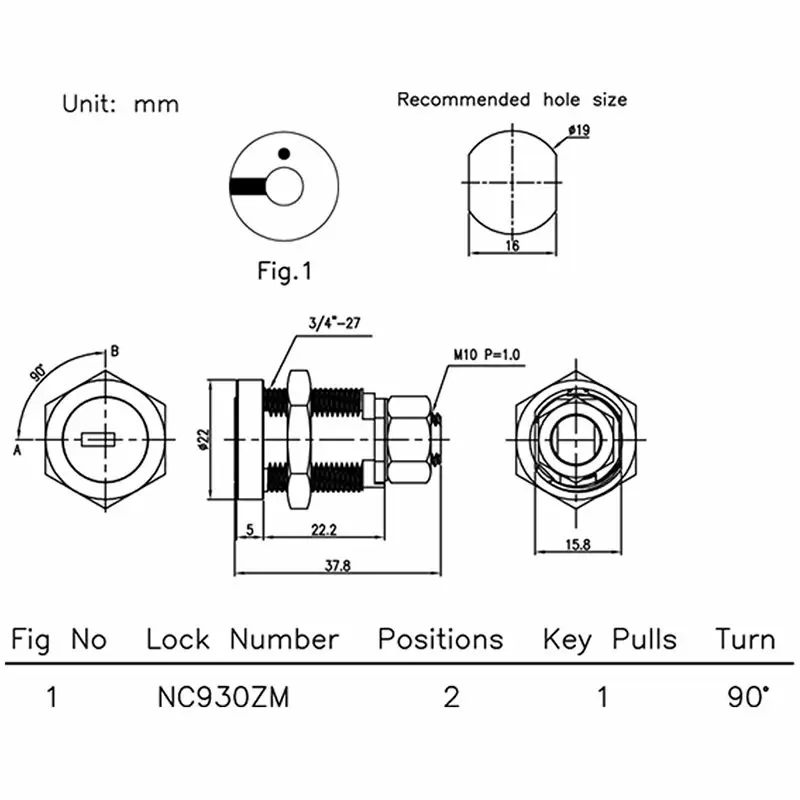 19mm外徑高安全性鎖,鍍鉻表面處理,鎖頭9個排片組合設計可以排列出最多10,000組號碼變化,鎖頭為平頭設計,加附KABA酒渦式鑰匙可加強防盜功能,鎖心有防塵塊裝置可簡單防止塵土或異物掉入鎖心影響鑰匙抽插。