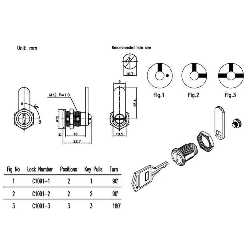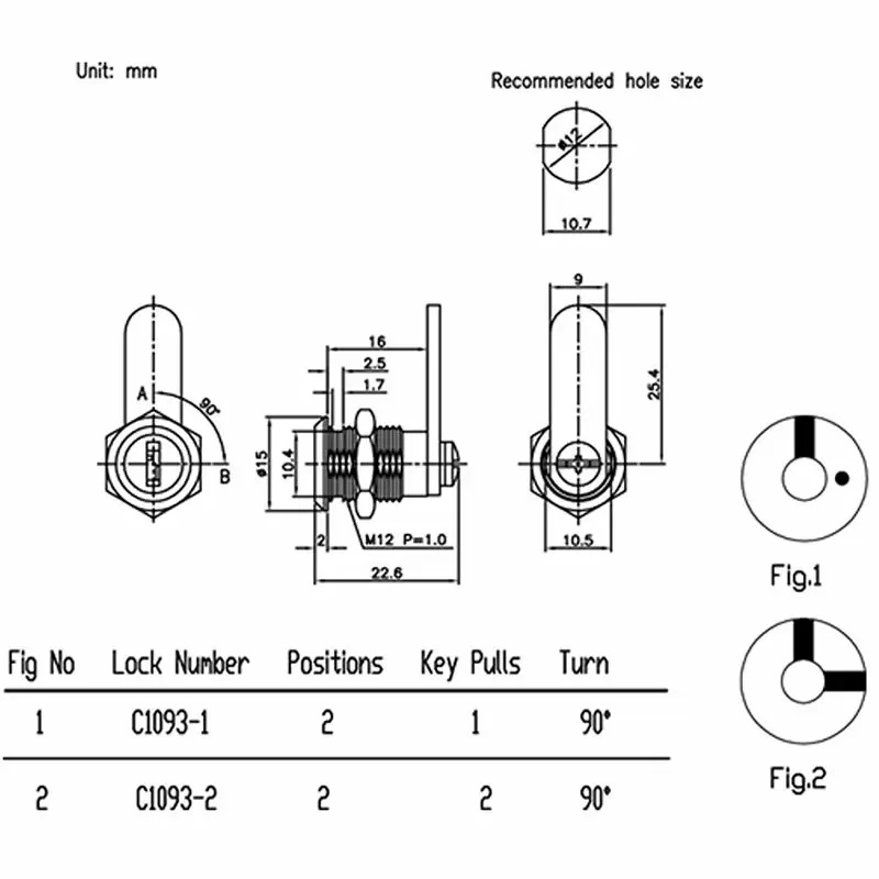 C1091鎖頭固定方式為六角螺母;C1093鎖頭固定方式為六角螺母或插片。