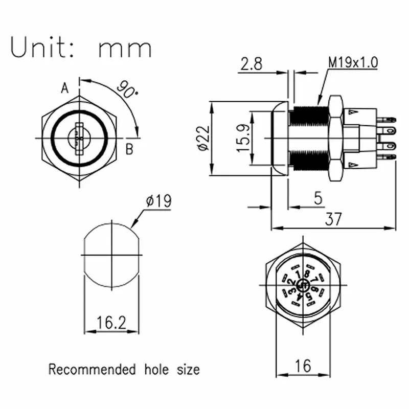 端子腳數量從3~8支依規格需求變化,有2~5段多段位設計,鑰匙抽出位置多款變化,各種型號與功能請參閱規格表。鑰匙抽插,電訊功能,都能依照客端需求做調整,鎖頭用六角螺母安裝固定,可依客戶需求增加加工工序,如:焊線,雷雕,打號.....等等,在便於生產的數量基礎下亦可依客戶需求客制規格。