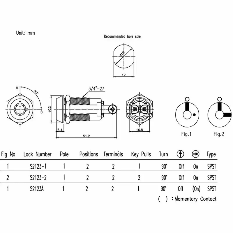 此款電源鎖是二段式設計,迴路型態SPST(單刀單擲),S203系列鑰匙轉向12-3點,電訊OFF-ON,鑰匙可為單抽僅於12點位置抽出,亦可為雙抽,可於12點及3點二處位置抽出;S203為螺絲型端子腳,S203A為平端子腳,S203B為圓柱端子腳,另有內裝彈簧瞬間接觸導通電流鑰匙復歸,在3點瞬間通電歸位,僅12點位置抽出,可依客戶需求增加加工工序,如:焊線、雷雕、打號.....等等,在便於生產的數量基礎下亦可依客戶需求客制規格。