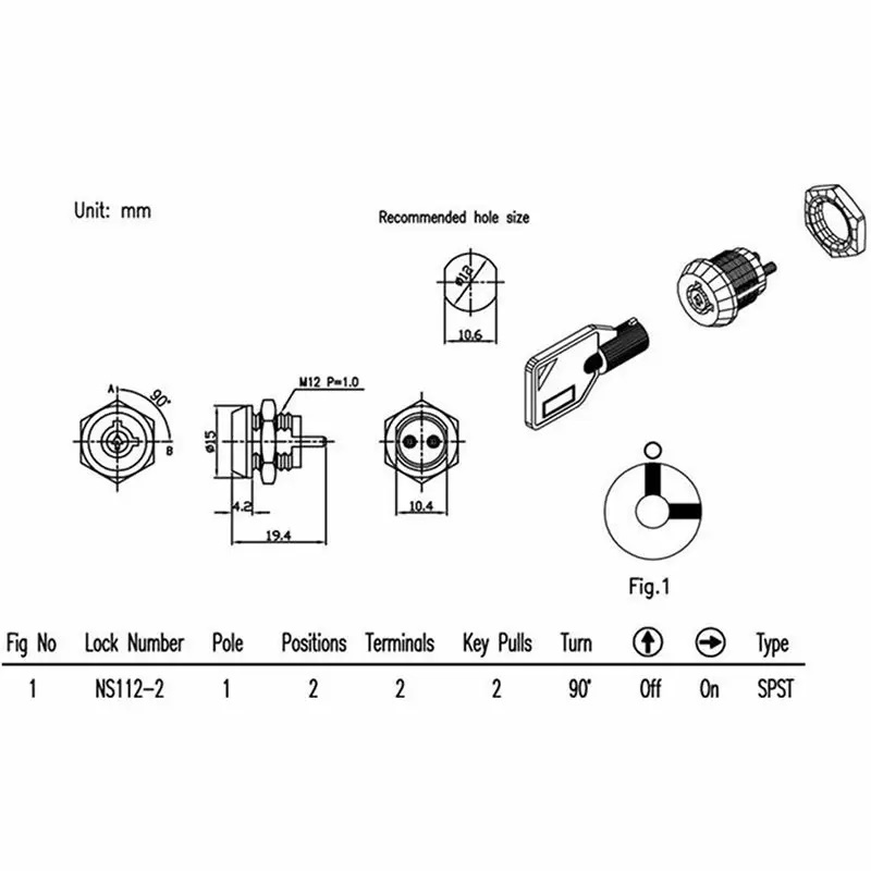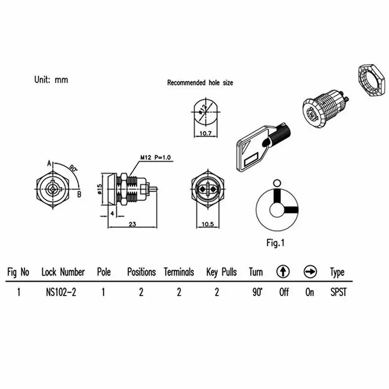 電源鎖NS1052及電源鎖NS102有2段,尾端兩支端子腳,鑰匙轉向12-3點,有電訊OFF-ON的設計,他的迴路型態屬於SPST(單刀單擲)。另外一款電源鎖NS1053有2段,尾端四支端子腳,轉向12-3點,電訊on-on,迴路型態SPDT(單刀雙擲)。電源鎖NS1054有3段,尾端四支端子腳,轉向11-12-3點,電訊OFF-ON-ON,迴路型態SPDT(單刀雙擲),鑰匙號為同號或6種號碼變化。電源鎖NS112為超短結構設計,可依組裝方式或空間選擇使用六角螺母或插片安裝鎖頭,亦可依客戶功能需求增加加工工序,如:焊線,雷雕,打號.....等等。